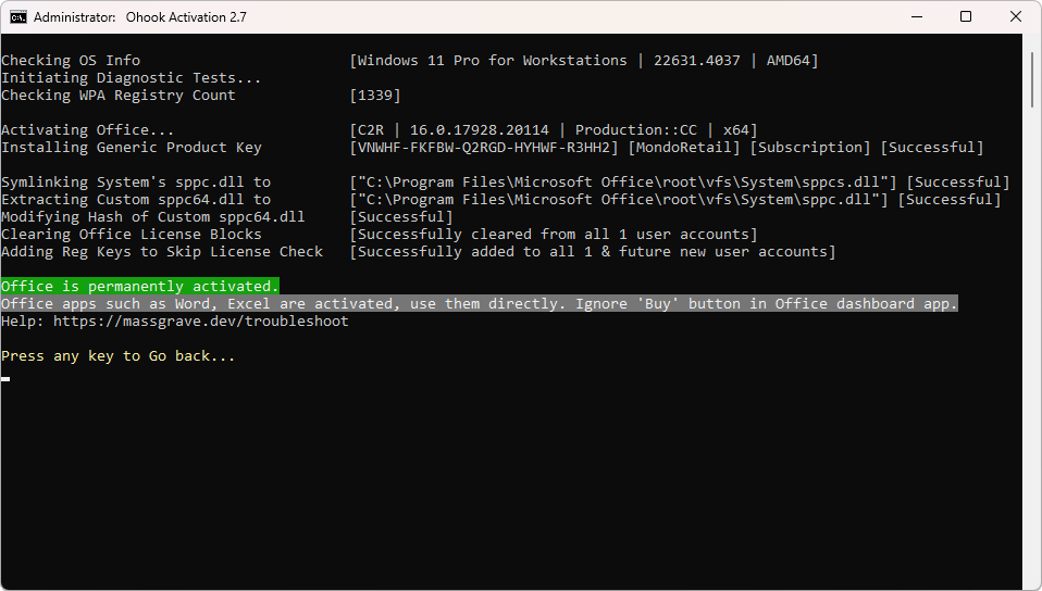 Open-source Windows and Office activator featuring HWID, Ohook, KMS38, and Online KMS activation methods, along with advanced troubleshooting.