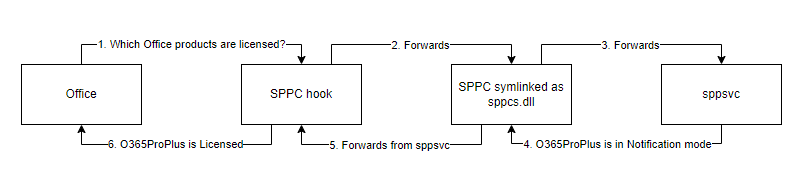 C:\Windows\System32\sppc.dllabout the activation status and that file asks the same thing to SPP (Software Protection Platform)C:\Windows\System32\sppsvc.exeand returns the message back to Office.